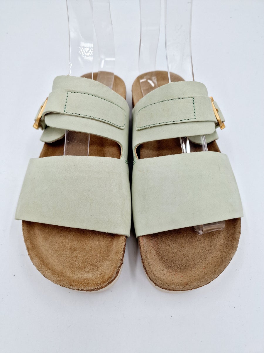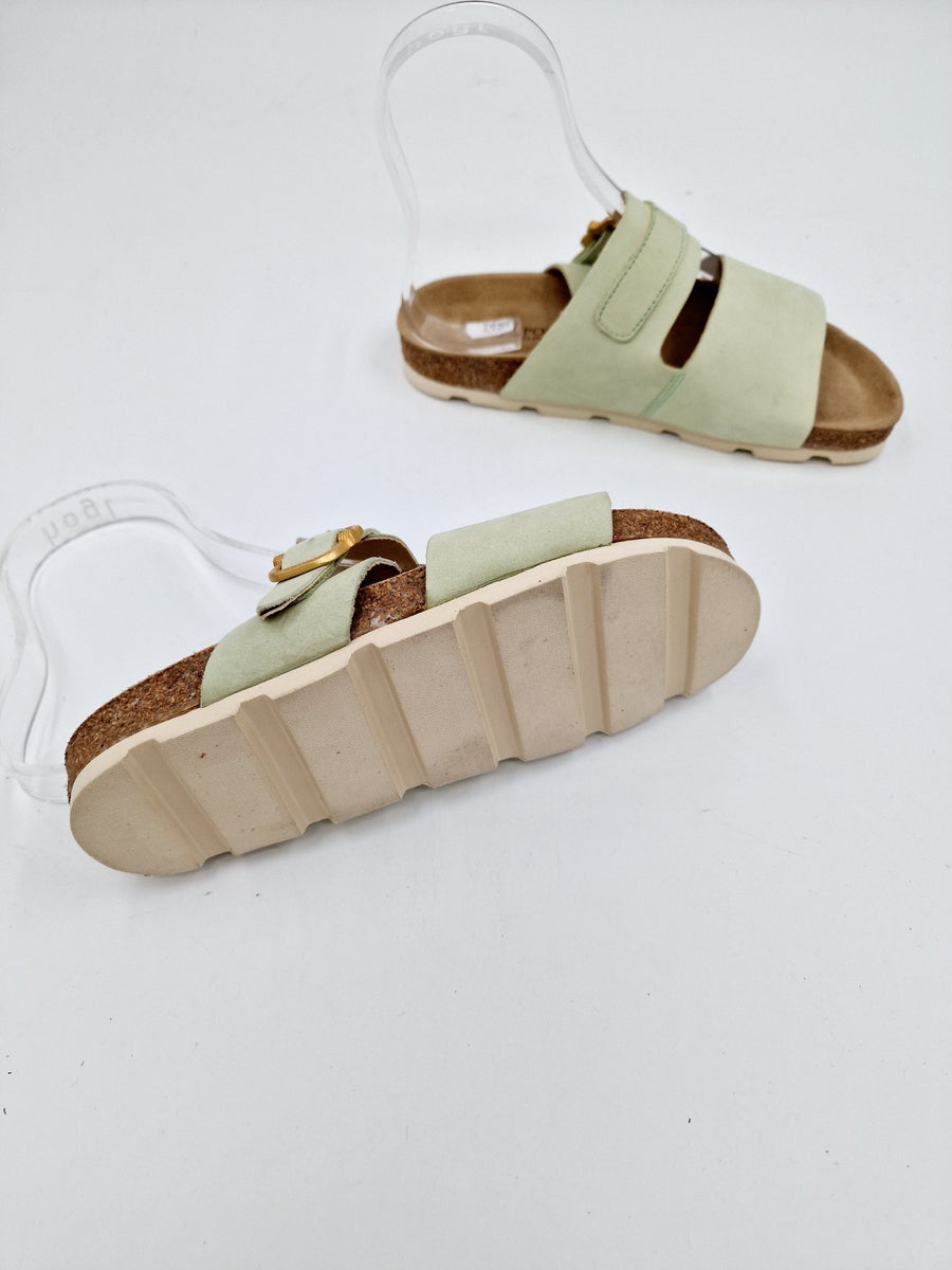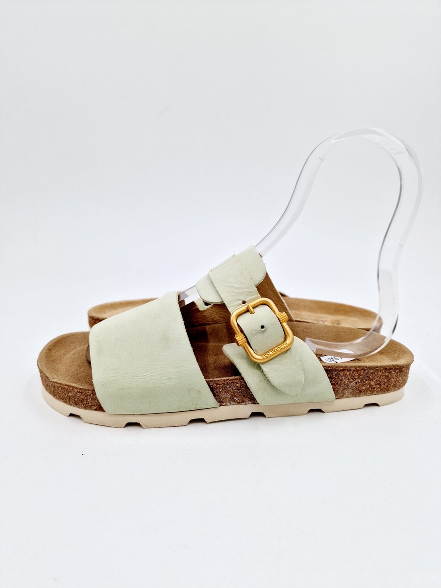 Our Vivienne sandal has a soft footbed for lazy days in the sun or for comfort indoors. This slip-in sandal made of soft nubuck has an over-foot buckle strap that can be easily adjusted to improve fit.